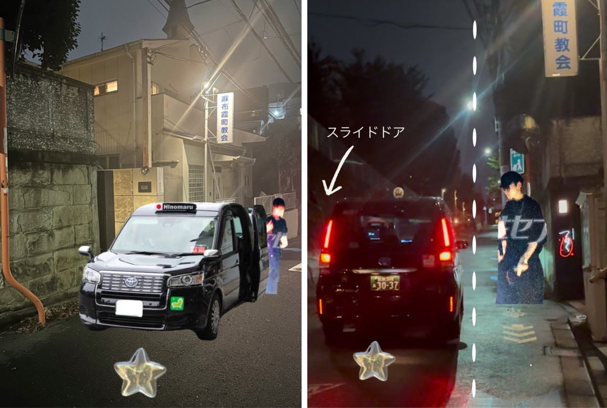 星のスタンプはその辺で盗撮してると仮定してて右側の写真の点線はれんれん側は右側がスライドドアになってるであろう車ごと切られてるという意味