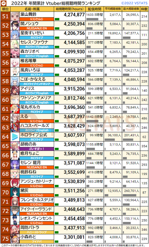 2022年 年間累計総視聴時間ランキング(51〜100位)
