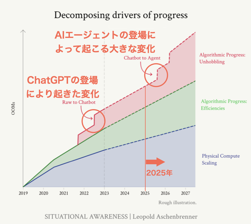 元OpenAIのアッシェンブレナーは2025年中にChatGPT誕生期と同じくらいの跳躍的進歩が起きると予想している。