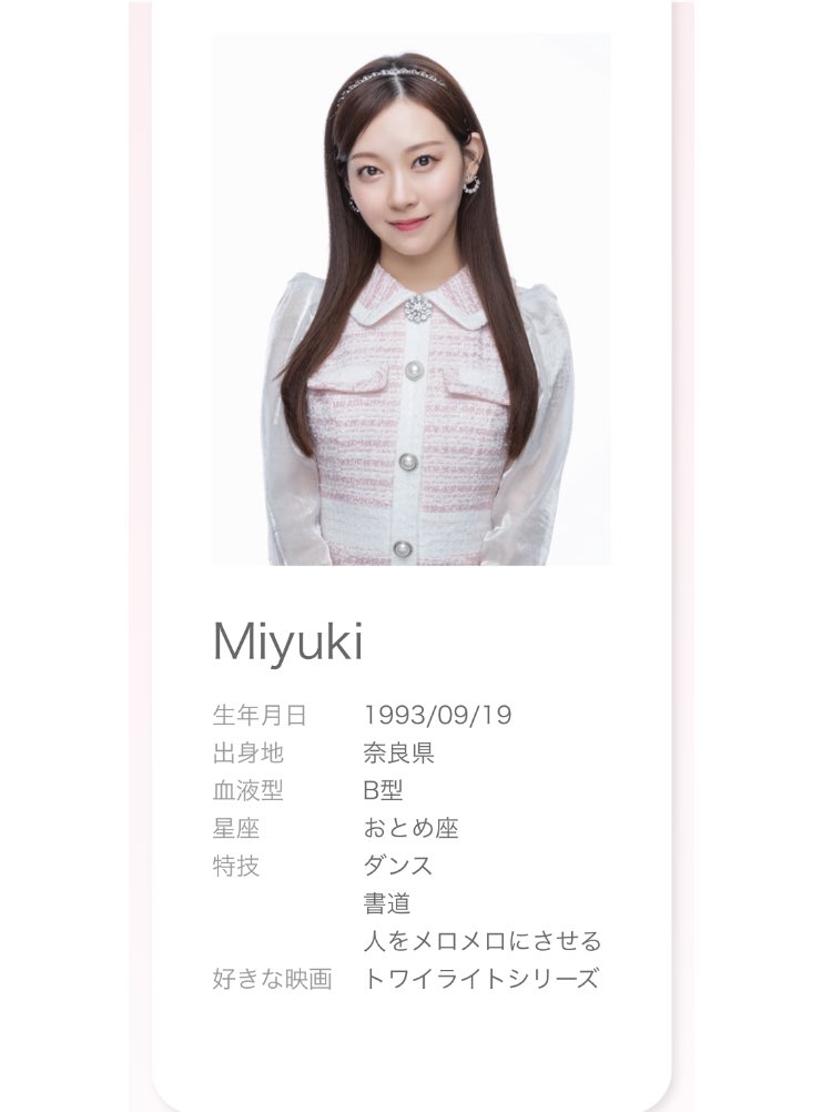 ●プロフィール ニックネーム : みるきー(Miyuki) 生年月日 : 1993年9月19日 血液型 : B型 出身地 : 奈良県 身長 : 156 cm 好きなもの : 赤ちゃん、ご飯を食べる事 好きな食べ物 : 焼肉、お寿司、桃、きゅうり 趣味 : 映画・舞台鑑賞、旅行 特技 : ダンス、書道、人をメロメロにさせる 嫌いなもの : 寝ている時に起こされる事、バンジージャンプ 所属事務所 : roundcell 所属レーベル : ワーナーミュージック・ジャパン・etichetta 所属ユニット : Ange et Folletta(アンジュ エ フォレッタ) https://pbs.twimg.com/media/ELTjzygUwAAsnns.jpg https://pbs.twimg.com/media/ELP-IUnU8AEf4-z.jpg:large https://pbs.twimg.com/media/ELP6wLTUYAAoSzZ.jpg:large